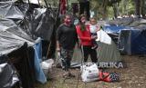 Fredy Pena dan istrinya Maria Burgos berpose bersama anak-anak mereka di luar tenda tempat mereka tinggal sejak awal bulan bersama migran Venezuela yang menganggur di Bogota, Kolombia, Rabu (10/6). Tukang kayu dan ibu rumah tangga itu meninggalkan Barquisimeto tempat asal mereka, Venezuela dua tahun lalu ke Cali, di mana ia bekerja mencuci mobil (FOTO : AP/Fernando Vergara)