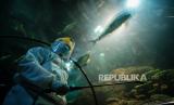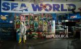 Petugas mengenakan pakaian pelindung diri menyemprotkan cairan disinfektan di area unit rekreasi Sea World Ancol, Jakarta, Rabu (17/6). Penyemprotan dilakukan dalam rangka persiapan dibuka kembali wahana rekreasi di Taman Impian Jaya Ancol pada masa PSBB transisi 20 Juni 2020 mendatang setelah hampir 3 bulan tutup akibat COVID-19 (FOTO : Republika/Thoudy Badai)