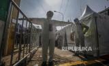 Petugas medis disemprotkan cairan desinfektan saat pelaksanaan rapid test massal COVID-19 di Cibinong, Kabupaten Bogor, Jawa Barat, Rabu (17/6/2020). Badan Intelijen Negara (BIN) menggelar tes diagnostik cepat (rapid rest) massal gratis kepada warga guna mendeteksi dan mengantisipasi penyebaran COVID-19 (FOTO : ANTARA/Yulius Satria Wijaya)