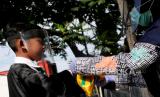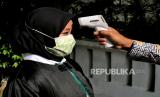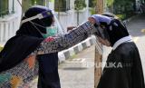Siswa SD diukur suhu tubuh sebelum prosesi wisuda drive thru di SD Masjid Syuhada, Yogyakarta, Kamis (18/6). Sebanyak 112 siswa SD Syuhada melakukan wisuda dengan drive thru imbas pandemi Covid19 (FOTO : Wihdan Hidayat/ Republika)