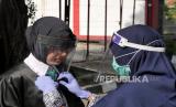 Guru memasangkan pelindung wajah siswa sebelum prosesi wisuda drive thru di SD Masjid Syuhada, Yogyakarta, Kamis (18/6). Sebanyak 112 siswa SD Syuhada melakukan wisuda dengan drive thru imbas pandemi Covid19 (FOTO : Wihdan Hidayat/ Republika)