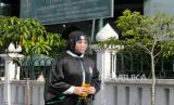 Siswa SD berjalan menuju tempat wisuda drive thru di SD Masjid Syuhada, Yogyakarta, Kamis (18/6). Sebanyak 112 siswa SD Syuhada melakukan wisuda dengan drive thru imbas pandemi Covid19 (FOTO : Wihdan Hidayat/ Republika)