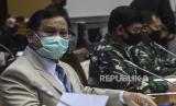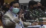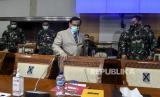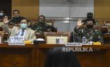 REPUBLIKA.CO.ID, JAKARTA -- Menteri Pertahanan (Menhan) Prabowo Subianto bersama Panglima TNI Marsekal TNI Hadi Tjahjanto mengikuti rapat kerja dengan Komisi I DPR di kompleks Parlemen, Jakarta, Kamis (18/6/2020).