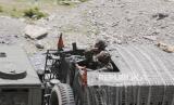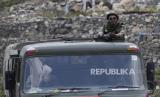 Seorang prajurit tentara India berjaga di salah satu kendaraan saat konvoi di jalan raya Srinagar-Ladakh di Gagangeer, India, Rabu (17/6). Pasukan keamanan India mengatakan tidak ada pihak yang melepaskan tembakan dalam bentrokan di wilayah Ladakh Senin malam (FOTO : AP/Mukhtar Khan)
