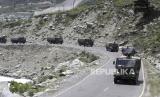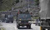 Sejumlah truk tentara India melintas di sepanjang jalan raya menuju Ladakh, di Gagangeer, India, Rabu (17/6). Menurut laporan, sebanyak dua puluh Personel Angkatan Darat India termasuk seorang kolonel tewas dalam bentrokan dengan pasukan Cina di Lembah Galwan di wilayah Ladakh timur karena pertempuran perbatasan (FOTO : EPA-EFE/FAROOQ KHAN)