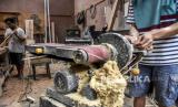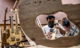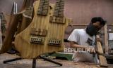 Perajin membuat alat musik gitar berbahan baku bambu di industri rumahan Virageawie, Jalan Melong Asih, Kota Cimahi, Jumat (19/6). Kerajinan bambu seperti alat musik bambu, peralatan rumah tangga, souvenir dan alat makan yang dipatok dengan harga Rp225 ribu hingga jutaan rupiah itu telah menembus pasar ekspor Malaysia, Taiwan, Jerman, Italia hingga Prancis (FOTO : ABDAN SYAKURA/REPUBLIKA)