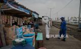 Petugas Dit Polair menyemprotkan cairan disinfektan di kawasan Pelabuhan Kaliadem, Muara Angke Jakarta, Jumat (19/6). Penyemprotan dilakukan di area pelabuhan dan kapal-kapal saat penerapan PSBB transisi setelah dibuka kembali jalur penyeberangan ke pulau seribu guna mengantisipasi penyebaran COVID-19 di kawasan tersebut (FOTO : Republika/Thoudy Badai)