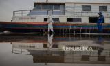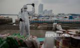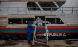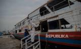 REPUBLIKA.CO.ID, JAKARTA -- Petugas Dit Polair menyemprotkan cairan disinfektan di kapal penumpang di Pelabuhan Kaliadem, Muara Angke Jakarta, Jumat (19/6).