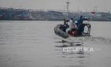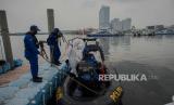 Petugas Dit Polair meninggalkan Pelabuhan Kaliadem usai melakukan penyemprotan disinfektan, Muara Angke Jakarta, Jumat (19/6). Penyemprotan dilakukan di area pelabuhan dan kapal-kapal saat penerapan PSBB transisi setelah dibuka kembali jalur penyeberangan ke pulau seribu guna mengantisipasi penyebaran COVID-19 di kawasan tersebut (FOTO : Republika/Thoudy Badai)