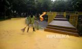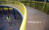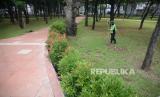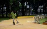 REPUBLIKA.CO.ID, JAKARTA -- Petugas Dinas Pertamanan dan Hutan Kota menyapu dedaunan di Taman Puring yang masih dalam kondisi tertutup untuk umum, Jakarta, Jumat (19/6).