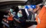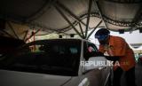 Petugas melakukan pengecekan kepada pengunjung saat akan memasuki kawasan Ancol, Jakarta, Sabtu (20/6). Taman Impian Jaya Ancol kembali dibuka setelah ditutup hampir 2 bulan akibat pandemi COVID-19 (FOTO : Republika/Thoudy Badai)