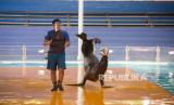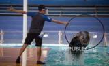 Pelatih menggunakan pelindung wajah mempertunjukan aktrasi sirkus anjing laut di unit rekreasi Samudera di kawasan Ancol, Jakarta, Sabtu (20/6). Taman Impian Jaya Ancol kembali dibuka setelah ditutup hampir 2 bulan akibat pandemi COVID-19 (FOTO : Republika/Thoudy Badai)