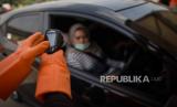 Petugas melakukan pengecekan suhu tubuh kepada pengunjung saat akan memasuki kawasan Ancol, Jakarta, Sabtu (20/6). Taman Impian Jaya Ancol kembali dibuka setelah ditutup hampir 2 bulan akibat pandemi COVID-19 (FOTO : Republika/Thoudy Badai)