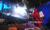 Petugas damkar menyemprotkan disinfektan di Pasar Minggu, Jakarta, Minggu (21/6/2020). Pemprov DKI Jakarta menutup Pasar Minggu dan melakukan sterilisasi akibat ditemukannya kasus positif COVID-19 (FOTO : Akbar Nugroho Gumay/ANTARA FOTO)