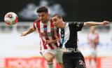 John Egan (kiri) dan Miguel Almiron berduel pada laga antara Newcastle United melawan Sheffield United di St James Park Stadium, Ahad (21/6). (FOTO : OWEN HUMPHREYS/ REUTERS POOL)