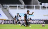 Jamaal Lascelles berlutut jelang laga antara Newcastle United melawan Sheffield United di St James Park Stadium, Ahad (21/6). (FOTO : AP Photo/Michael Regan)