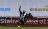 Allan Saint-Maximin berlutut saat merayakan golnya pada laga antara Newcastle United melawan Sheffield United di St James Park Stadium, Ahad (21/6). (FOTO : AP Photo/Owen Humphreys)