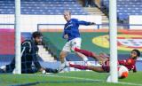 Sepakan Tom Davies membentur tiang Liverpool pada laga Everton vs Liverpool di Goodison Park, Senin (22/6) dini hari. (FOTO : JON SUPER/POOL VIA REUTERS)