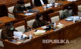 Menteri Keuangan Sri Mulyani mengikuti rapat kerja bersama Komisi XI DPR di Kompleks Parlemen Senayan, Jakarta, Senin (22/6/2020). Raker tersebut membahas asumsi dasar Kerangka Ekonomi Makro dan Pokok-Pokok Kebijakan Fiskal (KEM-PPKF) Rancangan Anggaran Pendapatan dan Belanja Negara (RAPBN) 2021. (FOTO : Antara/Puspa Perwitasari)