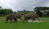 Gajah peliharaan Taman Wisata Candi (TWC) Borobudur Zella dan Echa berjalan beriringan menuju taman Lumbini, Borobudur, Magelang, Jawa Tengah. (FOTO : ANIS EFIZUDIN/ANTARAFOTO)