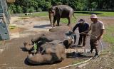 Mahout memandikan gajah di kandang mereka. (FOTO : ANIS EFIZUDIN/ANTARAFOTO)