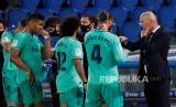 Pelatih Real Madrid Zinedine Zidane (kanan) berbicara dengan para pemainnya pada pertandingan sepak bola LaLiga Spanyol antara Real Sociedad vs Real Madrid di stadion Real Arena di San Sebastian, Basque Country, Spanyol, Ahad (21/6). Pertandingan berakhir dengan kemenangan Real Madrid dengan skor 2-1. EPA-EFE/Juan Herrero (FOTO : EPA-EFE/Juan Herrero )