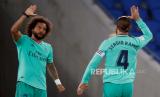 Pemain Real Madrid Sergio Ramos (kanan) bersama Marcelo da Silva (kiri) merayakan gol pada pertandingan sepak bola LaLiga Spanyol antara Real Sociedad vs Real Madrid di stadion Real Arena di San Sebastian, Basque Country, Spanyol, Ahad (21/6). Pertandingan berakhir dengan kemenangan Real Madrid dengan skor 2-1. EPA-EFE/Juan Herrero (FOTO : EPA-EFE/Juan Herrero )