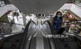 Pengunjung menggunakan tangga berjalan yang sudah dipasang tanda jarak fisik di Pasar Andir Trade Center, Jalan Waringin, Kota Bandung, Selasa (23/6). Pengelola pasar tersebut menerapkan protokol kesehatan serta memberlakukan aturan berupa sistem buka kios berdasarkan tanggal (ganjil genap) untuk mengurangi penyebaran Covid-19. Foto: Abdan Syakura/Republika (FOTO : ABDAN SYAKURA/REPUBLIKA)
