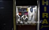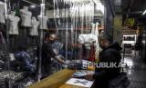 Pedagang beraktivitas di balik tirai sekat plastik di kiosnya di Pasar Andir Trade Center, Jalan Waringin, Kota Bandung, Selasa (23/6). Pengelola pasar tersebut menerapkan protokol kesehatan serta memberlakukan aturan berupa sistem buka kios berdasarkan tanggal (ganjil genap) untuk mengurangi penyebaran Covid-19. Foto: Abdan Syakura/Republika (FOTO : ABDAN SYAKURA/REPUBLIKA)