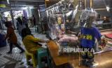 Pedagang melayani pembeli di balik tirai sekat plastik di kiosnya di Pasar Andir Trade Center, Jalan Waringin, Kota Bandung, Selasa (23/6). Pengelola pasar tersebut menerapkan protokol kesehatan serta memberlakukan aturan berupa sistem buka kios berdasarkan tanggal (ganjil genap) untuk mengurangi penyebaran Covid-19. Foto: Abdan Syakura/Republika (FOTO : ABDAN SYAKURA/REPUBLIKA)