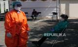Petugas medis menunggu warga saat tes Swab massal di Dinas Kesehatan Bantul, Yogyakarta, Selasa (23/6). Dinas Kesehatan (Dinkes) Bantul akan menggelar tes usap (swab) massal terhadap 5.000 orang. Proses tersebut sudah dimulai dengan tes swab dengan real time polymerase chain reaction (RT-PCR) terhadap 200 pelaku perjalanan. Tes usap massal bagi 200 pelaku perjalanan oleh Dinkes Bantul akan dilakukan selama empat hari dalam dua periode, yakni periode pertama dilakukan pada 23 Juni dan 24 Juni kepada 100 orang, kemudian periode kedua pada 25 dan 26 Juni kepada 100 orang. (FOTO : Wihdan Hidayat/ Republika)