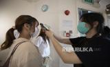 Pengunjung diperiksa suhu tubuhnya ketika memasuki di Cat Cafe Neko no Niwa di Singapura, Jumat (19/6). Kafe kucing pertama di Singapura tersebut dibuka kembali pada 19 Juni 2020 setelah lebih dari dua bulan ditutup sebagai tindakan Singapura mencegah COVID-19. Kafe telah menerapkan pembatasan kapasitas, pemeriksaan suhu saat masuk masuk dan keluar, sementara pengunjung harus mematuhi langkah-langkah kebersihan dan jarak sosial yang ketat saat berada di kafe. (FOTO : EPA-EFE/HOW HWEE YOUNG)
