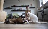 Pengunjung bermain dengan kucing di Cat Cafe Neko no Niwa di Singapura, Jumat (19/6). Kafe kucing pertama di Singapura tersebut dibuka kembali pada 19 Juni 2020 setelah lebih dari dua bulan ditutup sebagai tindakan Singapura mencegah COVID-19. Kafe telah menerapkan pembatasan kapasitas, pemeriksaan suhu saat masuk masuk dan keluar, sementara pengunjung harus mematuhi langkah-langkah kebersihan dan jarak sosial yang ketat saat berada di kafe. (FOTO : EPA-EFE/HOW HWEE YOUNG)