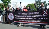 Puluhan massa yang tergabung dalam Forum Ormas Islam (Formasi) menggelar aksi menolak Rancangan Undang-Undang Haluan Ideologi Pancasila (RUU HIP) di depan Gedung DPRD Jawa Barat, Jalan Diponegoro, Kota Bandung, Rabu (24/6). Dalam aksi tersebut Formasi menolak semua bentuk aturan perundangan yang mengarah kepada komunisme, mendukung maklumat MUI dan menangkap inisiator panitia kerja (panja) RUU HIP dan dimejahijaukan. (FOTO : Edi Yusuf/Republika)