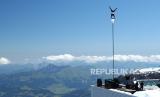 Pemain akrobat Swiss Freddy Nock saat beraksi di atas kabel di ketinggian 3000 meter dalam acara Glacier 3000 Air Show di Les Diablerets, Swiss (23/6). (FOTO : REUTERS/DENIS BALIBOUSE)