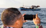 Anggota Marinir mengabadikan kapal yang ditumpangi pengungsi etnis Rohingya saat ditarik dari tengah laut menuju pesisir Bayu, Aceh Utara, Aceh, Rabu (24/6/2020). Sebanyak 94 orang pengungsi etnis Rohingya, terdiri dari 15 orang laki-laki, 49 orang perempuan dan 30 orang anak-anak ditemukan terdampar di tengah laut dengan kondisi kapal rusak, sebanyak 15 orang lainnya dilaporkan meninggal di laut selama mereka terdampar di perairan Indonesia hingga ke Aceh. (FOTO : ANTARA/RAHMAD)