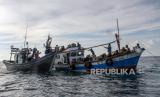 REPUBLIKA.CO.ID, ACEH UTARA -- Kapal yang ditumpangi pengungsi etnis Rohingya ditarik dari tengah laut menuju pesisir Bayu, Aceh Utara, Aceh, Rabu (24/6).