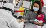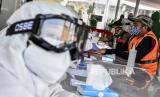Petugas memeriksa suhu tubuh warga menggunakan helm deteksi suhu tubuh saat rapid test masal di Gedung Promosi Bandung, Jalan Raya Cijerah, Kota Bandung, Kamis (25/6). Badan Intelijen Negara (BIN) menggelar tes diagnostik cepat (rapid test) massal gratis kepada warga guna mendeteksi dan mengantisipasi penyebaran Covid-19. Foto: Abdan Syakura/Republika (FOTO : ABDAN SYAKURA/REPUBLIKA)