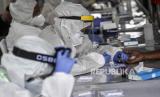 Petugas medis memeriksa sampel darah warga saat rapid test masal di Gedung Promosi Bandung, Jalan Raya Cijerah, Kota Bandung, Kamis (25/6). Badan Intelijen Negara (BIN) menggelar tes diagnostik cepat (rapid test) massal gratis kepada warga guna mendeteksi dan mengantisipasi penyebaran Covid-19. Foto: Abdan Syakura/Republika (FOTO : ABDAN SYAKURA/REPUBLIKA)