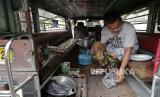 Sopir Michael Navarra menyiapkan telur untuk dimasak di dalam jeepney di terminal Tandang Sora yang telah menjadi rumah bagi mereka sejak lockdown dimulai tiga bulan lalu di kota Quezon, Filipina, Rabu (17/6). Sekitar 35 pengemudi jeepney terpaksa tetap tinggal di terminal akibat adanya pembatasan perjalanan dan menjadikan jeepney sebagai tempat tinggal karena pemerintah melarang angkutan umum beroprasi selama masyarakat isolasi diri untuk mencegah penyebaran Covid-19. Banyak pengemudi yang menganggur dan terpaksa mengemis di jalan-jalan, memajang papan nama bertuliskan permohonan uang dan makanan di jipney mereka. Foto AP / Aaron Favila (FOTO : AP/Aaron Favila)