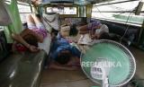 Keluarga Recio tidur di dalam jeepney yang telah menjadi rumah mereka sejak lockdown dimulai tiga bulan lalu di terminal Tandang Sora, di kota Quezon, Filipina, Rabu (17/6). Sekitar 35 pengemudi jeepney terpaksa tetap tinggal di terminal akibat adanya pembatasan perjalanan dan menjadikan jeepney sebagai tempat tinggal karena pemerintah melarang angkutan umum beroprasi selama masyarakat isolasi diri untuk mencegah penyebaran Covid-19. Banyak pengemudi yang menganggur dan terpaksa mengemis di jalan-jalan, memajang papan nama bertuliskan permohonan uang dan makanan di jipney mereka. Foto AP / Aaron Favila (FOTO : AP/Aaron Favila)