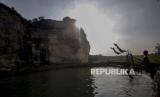 Sejumlah anak bermain di kolam bekas galian tambang gunung kapur, Klapanunggal, Kabupaten Bogor, Jawa Barat, Kamis (25/6/2020). Tempat bekas tambang kapur tersebut banyak didatangi warga dan menjadi potensi wisata alam baru bagi warga Bogor dan sekitarnya. (FOTO : ANTARA/Yulius Satria Wijaya)