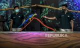 Pawang satwa bersama satwa melakukan atraksi saat hari pertama pembukaan kembali Bandung Zoological Garden, Kota Bandung, Sabtu, (27/6). Bandung Zoological Garden atau Kebun Binatang Bandung kembali dibuka pada masa adaptasi kebiasaan baru (AKB) dengan menerapkan protokol kesehatan serta membatasi jumlah pengunjung menjadi 30 persen dari kapasitas. Foto: Abdan Syakura/Republika (FOTO : ABDAN SYAKURA/REPUBLIKA)