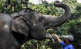 Pawang satwa mengenakan masker memberi pakan gajah saat hari pertama pembukaan kembali Bandung Zoological Garden, Kota Bandung, Sabtu, (27/6). Bandung Zoological Garden atau Kebun Binatang Bandung kembali dibuka pada masa adaptasi kebiasaan baru (AKB) dengan menerapkan protokol kesehatan serta membatasi jumlah pengunjung menjadi 30 persen dari kapasitas. Foto: Abdan Syakura/Republika (FOTO : ABDAN SYAKURA/REPUBLIKA)