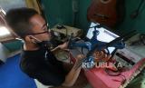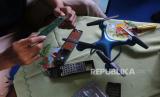 REPUBLIKA.CO.ID, KEDIRI -- Pelajar Madrasah Aliyah Negeri 2 Kota Kediri, Muhammad Azhar Syahruddin mengambil rangkaian remote kontrol televisi bekas untuk diprogram ulang sebagai chip kontrol pesawat nirawak (drone) buatannya di Desa Bendo, Kediri, Jawa Timur, Sabtu (27/6).