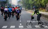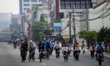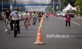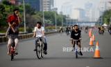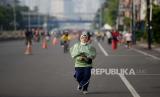 Warga berolahraga saat Hari Bebas Kedaraan Bermotor (HBKB) atau Car Free Day (CFD) di Jalan Gajah Mada, Jakarta, Ahad (28/6). Pemprov DKI Jakarta menggelar HBKB di 32 lokasi baru untuk menggantikan HBKB yang ditiadakan di jalan Sudirman-Thamrin dengan alasan menghindari terjadinya krumunan warga untuk mencegah penyebaran Covid-19.Prayogi/Republika (FOTO : Prayogi/Republika)