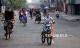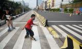 Anak-anak berolahraga saat Hari Bebas Kedaraan Bermotor (HBKB) atau Car Free Day (CFD) di Jalan Gajah Mada, Jakarta, Ahad (28/6). Pemprov DKI Jakarta menggelar HBKB di 32 lokasi baru untuk menggantikan HBKB yang ditiadakan di jalan Sudirman-Thamrin dengan alasan menghindari terjadinya krumunan warga untuk mencegah penyebaran Covid-19.Prayogi/Republika (FOTO : Republika/Prayogi)