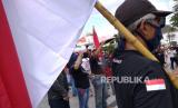 Anggota Front Marhaenis Daerah Istimewa Yogyakarta menggelar aksi unjuk rasa terkait polemik Rancangan Undang-undang Haluan Idiologi Pancasila (RUU HIP) di Titik Nol, Yogyakarta, Senin (29/6). Mereka menolak politisasi Pancasila dan isu Komunisme bangkit yang belakangan berbuntut panjang. Selain itu, aksi ini juga imbas insiden pembakaran bendera salah satu partai dalam aksi penolakan RUU HIP beberapa waktu lalu. (FOTO : Republika/Wihdan Hidayat)