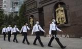 Petugas keamanan mengenakan masker saat berbaris melewati patung bergaya Eropa di Beijing, Senin, (29/6). Kasus COVID-19 di dunia mencatatkan angka tertinggi dalam 24 jam terakhir pada Ahad (28/6), dengan jumlah lebih dari 10 juta kasus positif dan 500.000 kematian.(AP Photo/Ng Han Guan) (FOTO : AP/Ng Han Guan)
