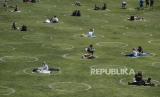 Pengunjung berada di dalam lingkaran yang membantu mmenjaga jarak sosial di Taman Dolores, San Francisco, Ahad (28/6). Kasus COVID-19 di dunia mencatatkan angka tertinggi dalam 24 jam terakhir pada Ahad (28/6), dengan jumlah lebih dari 10 juta kasus positif dan 500.000 kematian. (AP Photo/Jeff Chiu) (FOTO : AP/Jeff Chiu)
